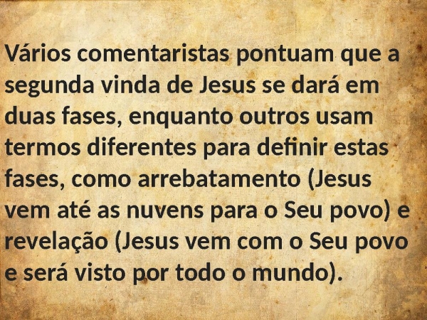 - Vários comentaristas pontuam que a segunda vinda de Jesus se dará em duas fases, enquanto outros usam termos diferentes para definir estas fases, como arrebatamento (Jesus vem até as nuvens para o Seu povo) e revelação (Jesus vem com o Seu povo e será visto por todo o mundo).