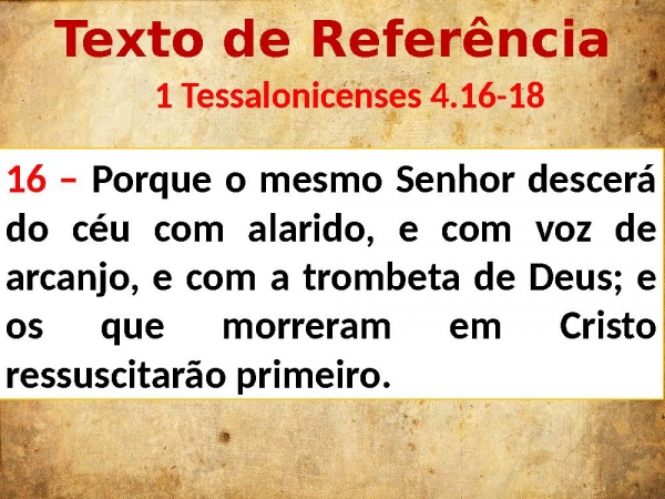 - Texto de Referência 1 Tessalonicenses 4.16-1816 – Porque o mesmo Senhor descerá do céu com alarido, e com voz de arcanjo, e com a trombeta de Deus; e os que morreram em Cristo ressuscitarão primeiro.