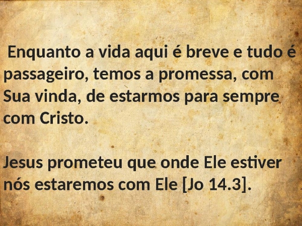- Enquanto a vida aqui é breve e tudo é passageiro, temos a promessa, com Sua vinda, de estarmos para sempre com Cristo.Jesus prometeu que onde Ele estiver nós estaremos com Ele [Jo 14.3].