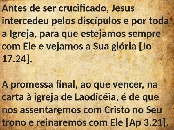 - Antes de ser crucificado, Jesus intercedeu pelos discípulos e por toda a Igreja, para que estejamos sempre com Ele e vejamos a Sua glória [Jo 17.24].A promessa final, ao que vencer, na carta à igreja de Laodicéia, é de que nos assentaremos com Cristo no Seu trono e reinaremos com Ele [Ap 3.21].