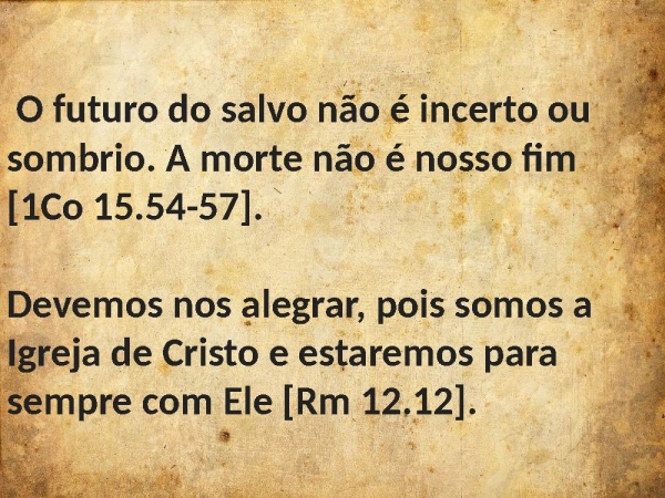 - O futuro do salvo não é incerto ou sombrio. A morte não é nosso fim [1Co 15.54-57].Devemos nos alegrar, pois somos a Igreja de Cristo e estaremos para sempre com Ele [Rm 12.12].