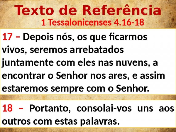 - Texto de Referência 1 Tessalonicenses 4.16-1817 – Depois nós, os que ficarmos vivos, seremos arrebatados juntamente com eles nas nuvens, a encontrar o Senhor nos ares, e assim estaremos sempre com o Senhor.18 – Portanto, consolai-vos uns aos outros com estas palavras.