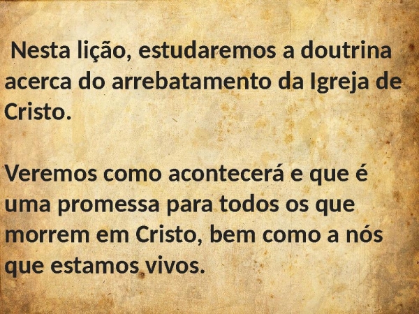 - Nesta lição, estudaremos a doutrina acerca do arrebatamento da Igreja de Cristo.Veremos como acontecerá e que é uma promessa para todos os que morrem em Cristo, bem como a nós que estamos vivos.