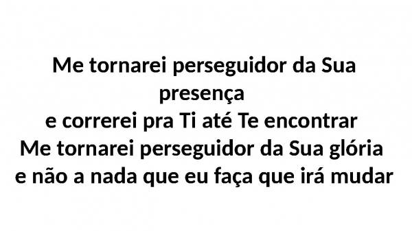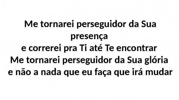 - Me tornarei perseguidor da Sua presença e correrei pra Ti até Te encontrar Me tornarei perseguidor da Sua glória e não a nada que eu faça que irá mudar