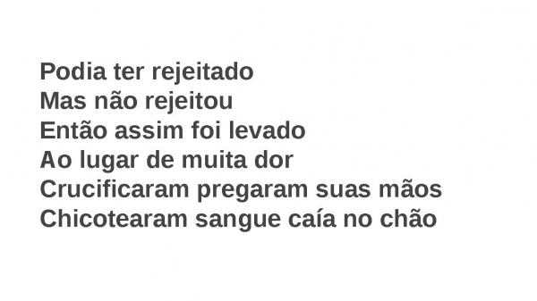 - Podia ter rejeitadoMas não rejeitouEntão assim foi levadoAo lugar de muita dorCrucificaram pregaram suas mãosChicotearam sangue caía no chão