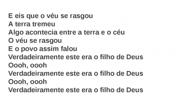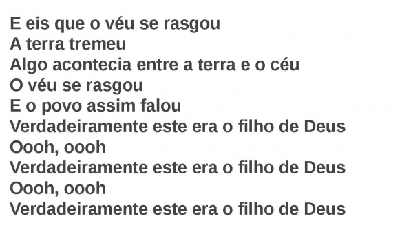 - E eis que o véu se rasgouA terra tremeuAlgo acontecia entre a terra e o céuO véu se rasgouE o povo assim falouVerdadeiramente este era o filho de DeusOooh, ooohVerdadeiramente este era o filho de DeusOooh, ooohVerdadeiramente este era o filho de Deus