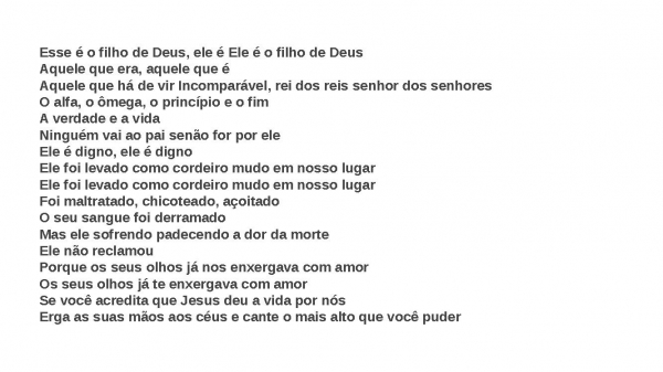 - Esse é o filho de Deus, ele é Ele é o filho de DeusAquele que era, aquele que éAquele que há de vir Incomparável, rei dos reis senhor dos senhoresO alfa, o ômega, o princípio e o fimA verdade e a vidaNinguém vai ao pai senão for por eleEle é digno, ele é dignoEle foi levado como cordeiro mudo em nosso lugarEle foi levado como cordeiro mudo em nosso lugarFoi maltratado, chicoteado, açoitadoO seu sangue foi derramadoMas ele sofrendo padecendo a dor da morteEle não reclamouPorque os seus olhos já nos enxergava com amorOs seus olhos já te enxergava com amorSe você acredita que Jesus deu a vida por nósErga as suas mãos aos céus e cante o mais alto que você puder