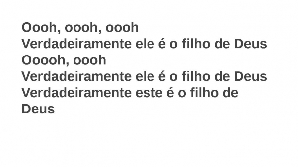- Oooh, oooh, ooohVerdadeiramente ele é o filho de DeusOoooh, ooohVerdadeiramente ele é o filho de DeusVerdadeiramente este é o filho de Deus