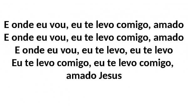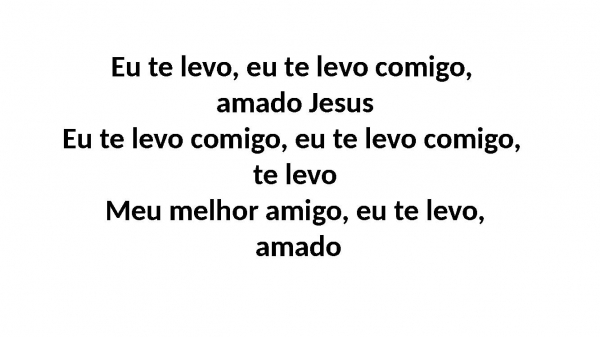 - Eu te levo, eu te levo comigo, amado JesusEu te levo comigo, eu te levo comigo, te levoMeu melhor amigo, eu te levo, amado
