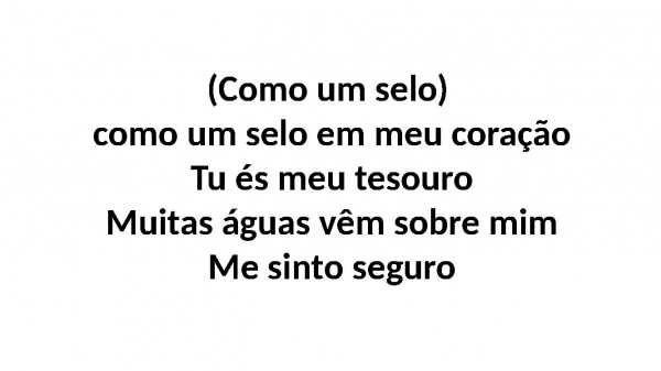 - (Como um selo) como um selo em meu coraçãoTu és meu tesouroMuitas águas vêm sobre mimMe sinto seguro