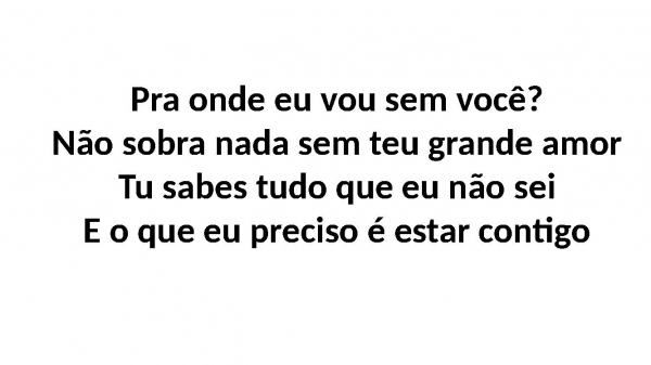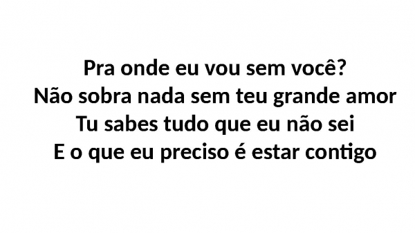 - Pra onde eu vou sem você?Não sobra nada sem teu grande amorTu sabes tudo que eu não seiE o que eu preciso é estar contigo