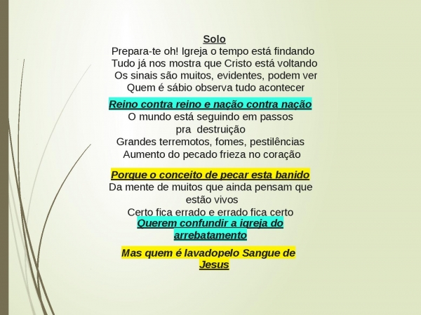 - SoloPrepara-te oh! Igreja o tempo está findando Tudo já nos mostra que Cristo está voltando Os sinais são muitos, evidentes, podem ver Quem é sábio observa tudo acontecerReino contra reino e nação contra naçãoO mundo está seguindo em passos pra destruiçãoGrandes terremotos, fomes, pestilências Aumento do pecado frieza no coraçãoPorque o conceito de pecar esta banidoDa mente de muitos que ainda pensam que estão vivosCerto fica errado e errado fica certoQuerem confundir a igreja doarrebatamentoMas quem é lavadopelo Sangue deJesus
