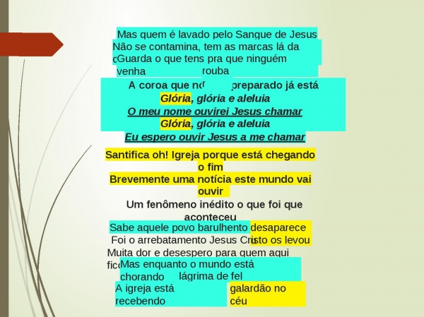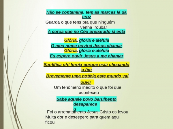 - Não se contamina, tem as marcas lá dacruzGuarda o que tens pra que ninguém venha roubarA coroa que no Céu preparado já está{2D5ABB26-0587-4C30-8999-92F81FD0307C}Glória,glória e aleluiaO meu nome ouvirei Jesus chamarGlória,glória e aleluiaEu espero ouvir Jesus a me chamarSantifica oh! Igreja porque está chegandoo fimBrevemente uma notícia este mundo vaiouvirUm fenômeno inédito o que foi que aconteceuSabe aquele povo barulhentodesapareceuFoi o arrebatamento Jesus Cristo os levou Muita dor e desespero para quem aqui ficou