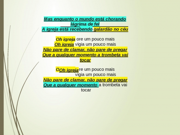 - {2D5ABB26-0587-4C30-8999-92F81FD0307C}Mas enquanto o mundo está chorandolágrima de felA igreja está recebendogalardão no céuOh igrejaore um pouco maisOh igrejavigia um pouco maisNão pare de clamar, não pare de pregarQue a qualquer momento a trombeta vaitocarOh igrejaore um pouco maisOh igrejavigia um pouco maisNão pare de clamar, não pare de pregarQue a qualquer momento a trombeta vaitocar