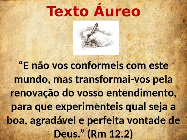 - Texto Áureo“E não vos conformeis com este mundo, mas transformai-vos pela renovação do vosso entendimento, para que experimenteis qual seja a boa, agradável e perfeita vontade de Deus.” (Rm 12.2)