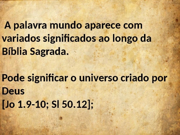 - A palavra mundo aparece com variados significados ao longo da Bíblia Sagrada.Pode significar o universo criado por Deus[Jo 1.9-10; Sl 50.12];