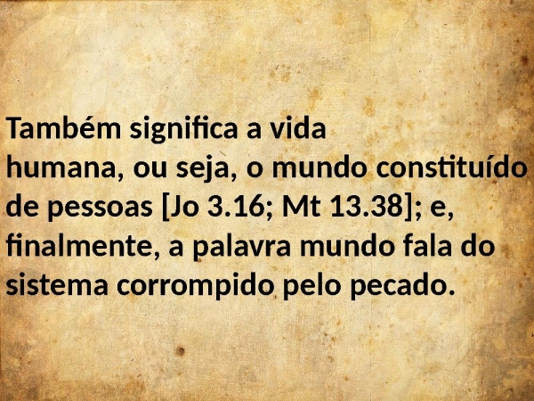 - Também significa a vida humana, ou seja, o mundo constituído de pessoas [Jo 3.16; Mt 13.38]; e, finalmente, a palavra mundo fala do sistema corrompido pelo pecado.
