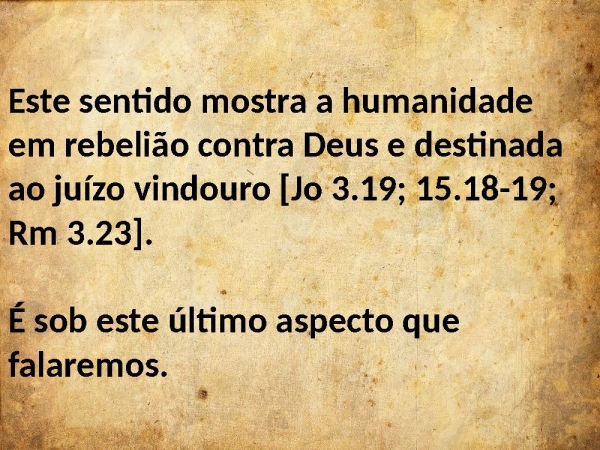 - Este sentido mostra a humanidade em rebelião contra Deus e destinada ao juízo vindouro [Jo 3.19; 15.18-19; Rm 3.23]. É sob este último aspecto que falaremos.