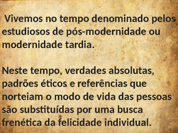 - Vivemos no tempo denominado pelos estudiosos de pós-modernidade ou modernidade tardia. Neste tempo, verdades absolutas, padrões éticos e referências que norteiam o modo de vida das pessoas são substituídas por uma busca frenética da felicidade individual.