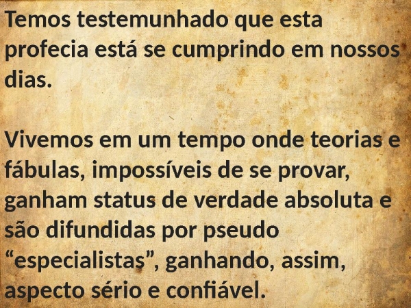 - Temos testemunhado que esta profecia está se cumprindo em nossos dias. Vivemos em um tempo onde teorias e fábulas, impossíveis de se provar, ganham status de verdade absoluta e são difundidas por pseudo “especialistas”, ganhando, assim, aspecto sério e confiável.