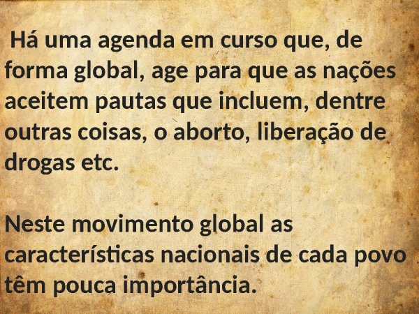- Há uma agenda em curso que, de forma global, age para que as nações aceitem pautas que incluem, dentre outras coisas, o aborto, liberação de drogas etc. Neste movimento global as características nacionais de cada povo têm pouca importância.