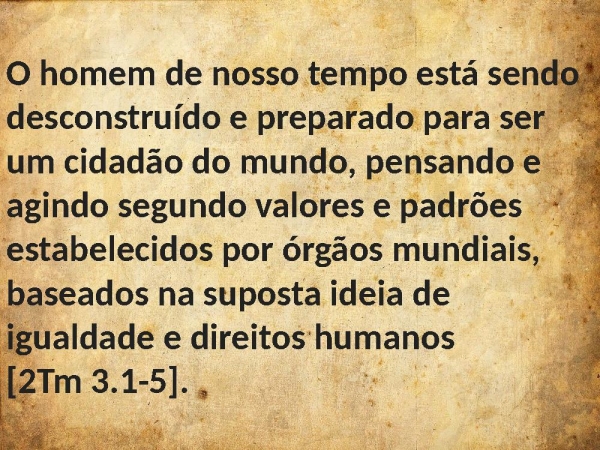 - O homem de nosso tempo está sendo desconstruído e preparado para ser um cidadão do mundo, pensando e agindo segundo valores e padrões estabelecidos por órgãos mundiais, baseados na suposta ideia de igualdade e direitos humanos [2Tm 3.1-5].