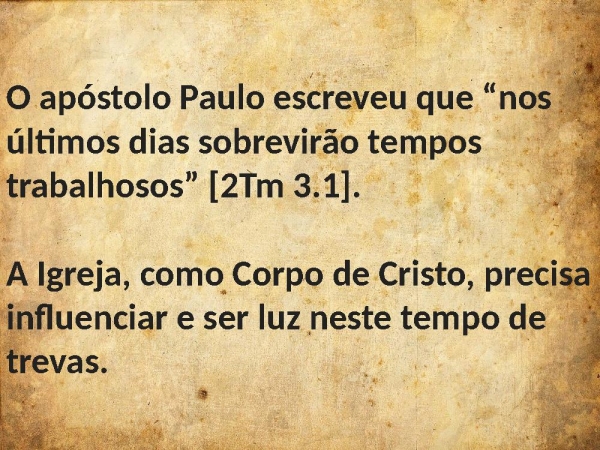 - O apóstolo Paulo escreveu que “nos últimos dias sobrevirão tempos trabalhosos” [2Tm 3.1]. A Igreja, como Corpo de Cristo, precisa influenciar e ser luz neste tempo de trevas.