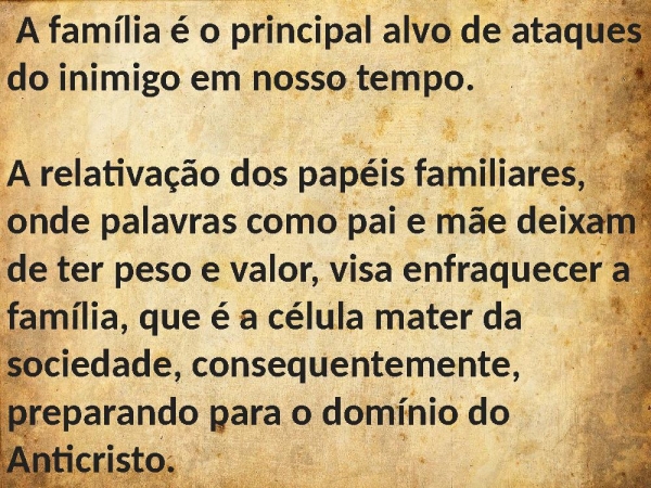 - A família é o principal alvo de ataques do inimigo em nosso tempo.A relativação dos papéis familiares, onde palavras como pai e mãe deixam de ter peso e valor, visa enfraquecer a família, que é a célula mater da sociedade, consequentemente, preparando para o domínio do Anticristo.