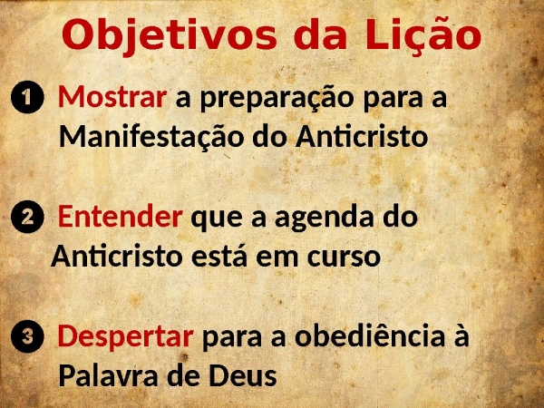 - Objetivos da Lição❶ Mostrar a preparação para a Manifestação do Anticristo❷ Entender que a agenda do Anticristo está em curso❸ Despertar para a obediência à Palavra de Deus