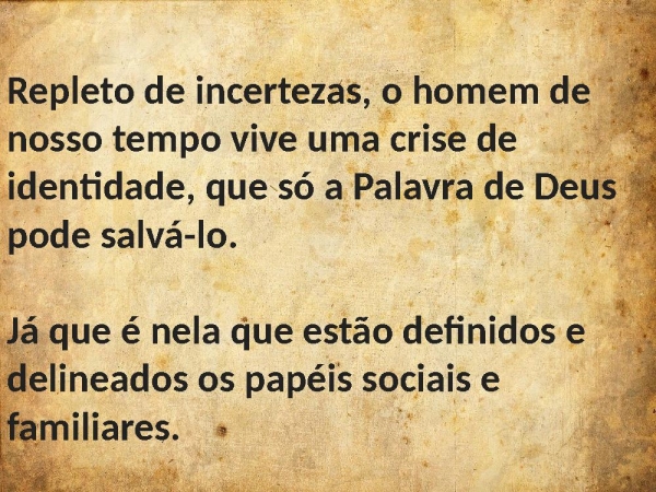 - Repleto de incertezas, o homem de nosso tempo vive uma crise de identidade, que só a Palavra de Deus pode salvá-lo. Já que é nela que estão definidos e delineados os papéis sociais e familiares.