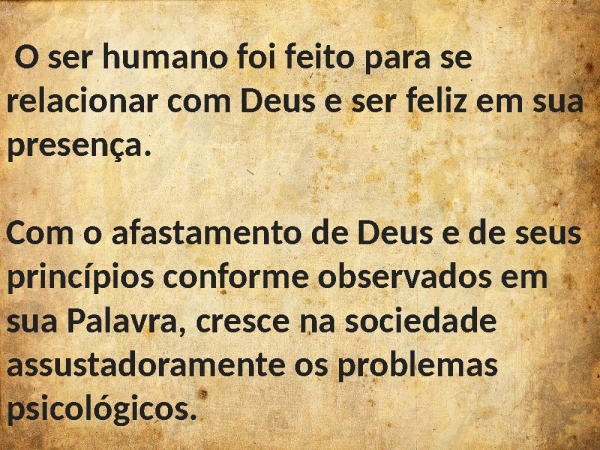 - O ser humano foi feito para se relacionar com Deus e ser feliz em sua presença. Com o afastamento de Deus e de seus princípios conforme observados em sua Palavra, cresce na sociedade assustadoramente os problemas psicológicos.
