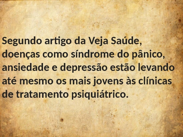 - Segundo artigo da Veja Saúde, doenças como síndrome do pânico, ansiedade e depressão estão levando até mesmo os mais jovens às clínicas de tratamento psiquiátrico.