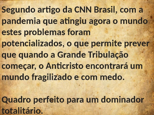 - Segundo artigo da CNN Brasil, com a pandemia que atingiu agora o mundo estes problemas foram potencializados, o que permite prever que quando a Grande Tribulação começar, o Anticristo encontrará um mundo fragilizado e com medo. Quadro perfeito para um dominador totalitário.