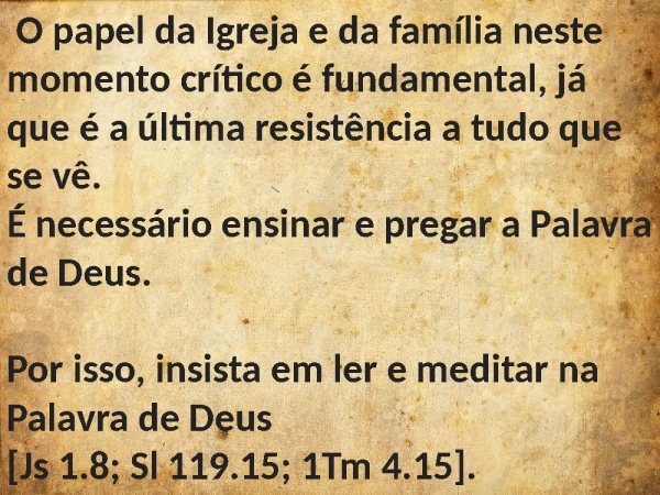 - O papel da Igreja e da família neste momento crítico é fundamental, já que é a última resistência a tudo que se vê. É necessário ensinar e pregar a Palavra de Deus. Por isso, insista em ler e meditar na Palavra de Deus [Js 1.8; Sl 119.15; 1Tm 4.15].