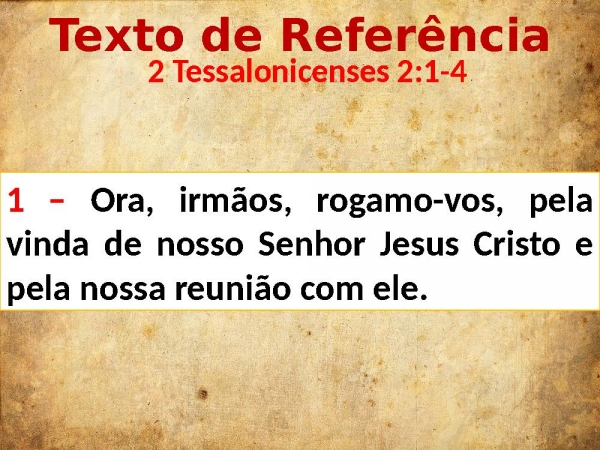 - Texto de Referência 2 Tessalonicenses 2:1-41 – Ora, irmãos, rogamo-vos, pela vinda de nosso Senhor Jesus Cristo e pela nossa reunião com ele.