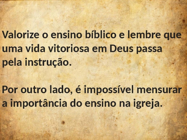 - Valorize o ensino bíblico e lembre que uma vida vitoriosa em Deus passa pela instrução.Por outro lado, é impossível mensurar a importância do ensino na igreja.