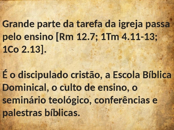 - Grande parte da tarefa da igreja passa pelo ensino [Rm 12.7; 1Tm 4.11-13; 1Co 2.13].É o discipulado cristão, a Escola Bíblica Dominical, o culto de ensino, o seminário teológico, conferências e palestras bíblicas.