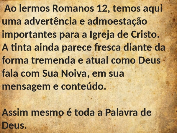 - Ao lermos Romanos 12, temos aqui uma advertência e admoestação importantes para a Igreja de Cristo.A tinta ainda parece fresca diante da forma tremenda e atual como Deus fala com Sua Noiva, em sua mensagem e conteúdo. Assim mesmo é toda a Palavra de Deus.