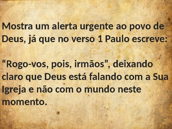 - Mostra um alerta urgente ao povo de Deus, já que no verso 1 Paulo escreve:“Rogo-vos, pois, irmãos”, deixando claro que Deus está falando com a Sua Igreja e não com o mundo neste momento.