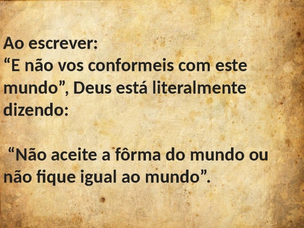 - Ao escrever: “E não vos conformeis com este mundo”, Deus está literalmente dizendo: “Não aceite a fôrma do mundo ou não fique igual ao mundo”.