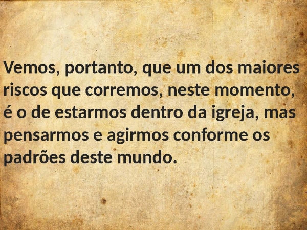- Vemos, portanto, que um dos maiores riscos que corremos, neste momento, é o de estarmos dentro da igreja, mas pensarmos e agirmos conforme os padrões deste mundo.