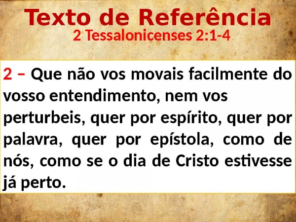 - Texto de Referência 2 Tessalonicenses 2:1-42 – Que não vos movais facilmente do vosso entendimento, nem vos perturbeis, quer por espírito, quer por palavra, quer por epístola, como de nós, como se o dia de Cristo estivesse já perto.