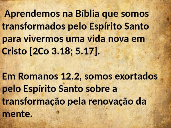 - Aprendemos na Bíblia que somos transformados pelo Espírito Santo para vivermos uma vida nova em Cristo [2Co 3.18; 5.17].Em Romanos 12.2, somos exortados pelo Espírito Santo sobre a transformação pela renovação da mente.