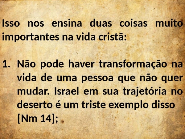 - Isso nos ensina duas coisas muito importantes na vida cristã:Não pode haver transformação na vida de uma pessoa que não quer mudar. Israel em sua trajetória no deserto é um triste exemplo disso [Nm 14];