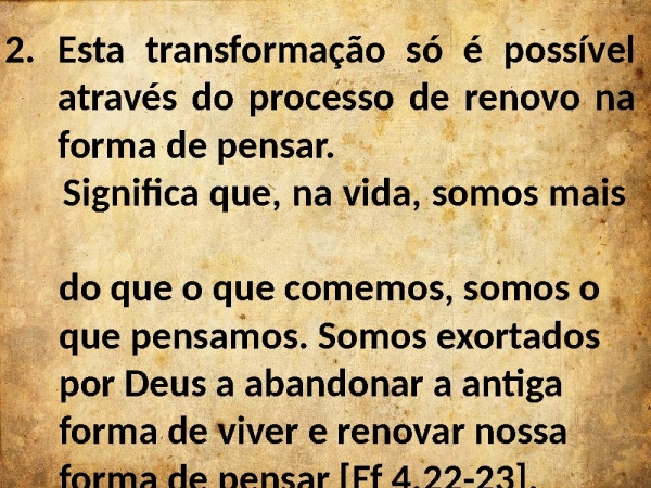 - Esta transformação só é possível através do processo de renovo na forma de pensar. Significa que, na vida, somos mais do que o que comemos, somos o que pensamos. Somos exortados por Deus a abandonar a antiga forma de viver e renovar nossa forma de pensar [Ef 4.22-23].