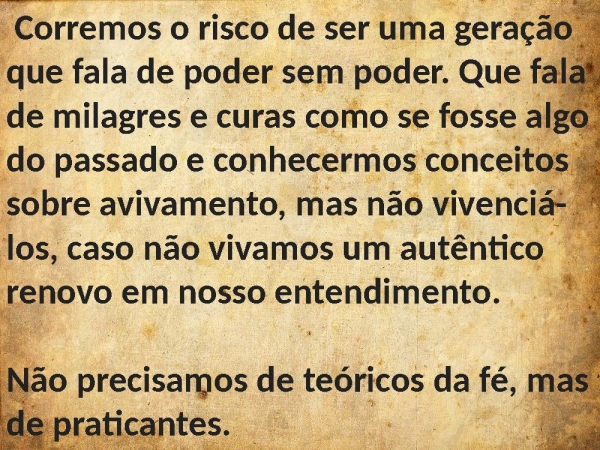 - Corremos o risco de ser uma geração que fala de poder sem poder. Que fala de milagres e curas como se fosse algo do passado e conhecermos conceitos sobre avivamento, mas não vivenciá-los, caso não vivamos um autêntico renovo em nosso entendimento. Não precisamos de teóricos da fé, mas de praticantes.