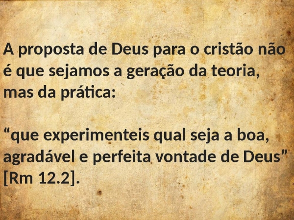 - A proposta de Deus para o cristão não é que sejamos a geração da teoria, mas da prática: “que experimenteis qual seja a boa, agradável e perfeita vontade de Deus” [Rm 12.2].