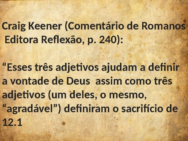 - Craig Keener (Comentário de Romanos Editora Reflexão, p. 240): “Esses três adjetivos ajudam a definir a vontade de Deus assim como três adjetivos (um deles, o mesmo, “agradável”) definiram o sacrifício de 12.1
