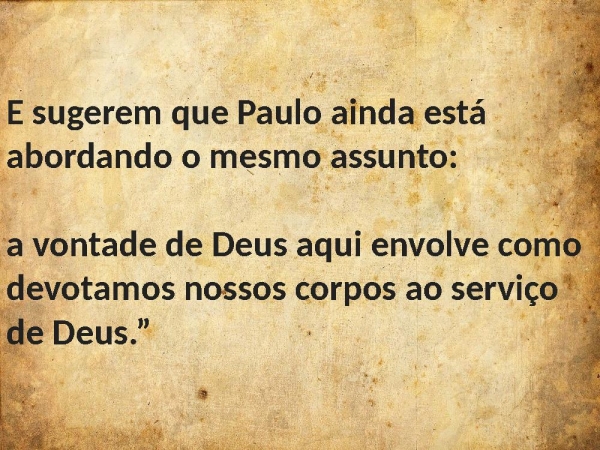 - E sugerem que Paulo ainda está abordando o mesmo assunto: a vontade de Deus aqui envolve como devotamos nossos corpos ao serviço de Deus.”