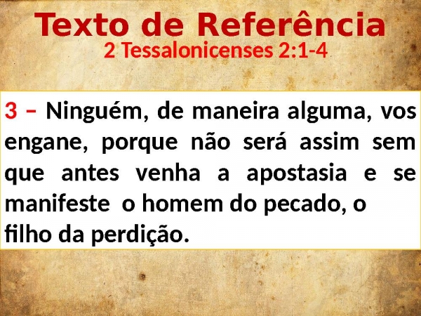 - Texto de Referência 2 Tessalonicenses 2:1-43 – Ninguém, de maneira alguma, vos engane, porque não será assim sem que antes venha a apostasia e se manifeste o homem do pecado, o filho da perdição.